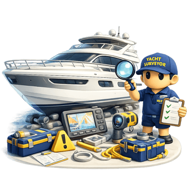 A yacht surveyor performs a detailed technical inspection of the vessel to evaluate its structural integrity, systems, and safety equipment.
