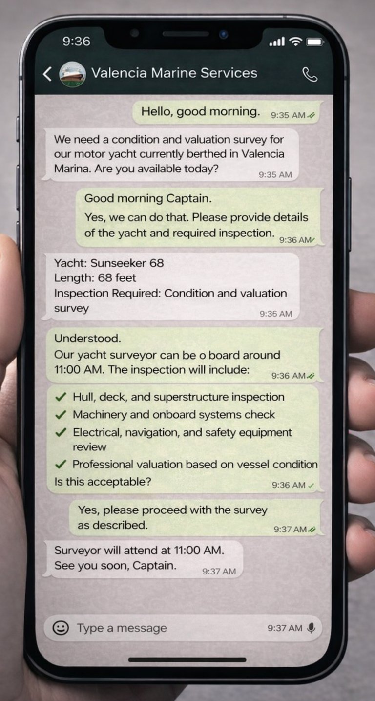 Contact an independent yacht surveyor instantly via WhatsApp to arrange a professional yacht survey in Valencia and across the Spanish Mediterranean.